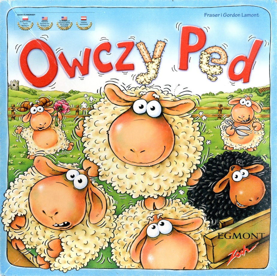 Owczy pęd : rodzinna gra logiczna / Fraser i Gordon Lamont ; il. Gabriela Silveira. - Warszawa : Egmont, 2013. - 1 pudełko (1 plansza, 11 figurek owiec w kartonowym pudełku, 48 kart ruchu owiec w 4 kolorach - po 12 niebieskich, zielonych, żółtych i czerwonych, 4 pionki do zaznaczania zdobytych punktów, czarny wskaźnik czasu, kolorowa kostka, karta Start, 4 karty ściągawki z opisami ruchów owiec, instrukcja) ; 29x29 cm.