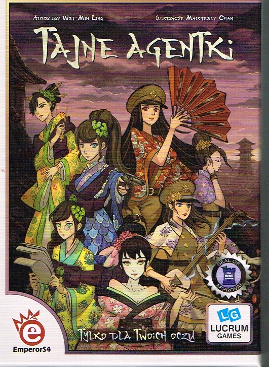 Tajne agentki / Wei-Min Ling ; ilustracje Maisherly Chan ; tłumaczenie Paweł Imperowicz. - Bielsko-Biała : Lucrum, 2018. - 1 pudełko (1 plansza; 12 pionków agentek (po 6 w 2 kolorach); 7 kart agentek specjalnych (po 3 dla każdego gracza + 1 neutralna); 50 kart lokacji (po 25 dla każdego gracza); 16 kart taktyk (po 8 dla każdego gracza); 6 kart ekwipunku (po 3 dla każdego gracza); instrukcja) ; 19x14 cm.