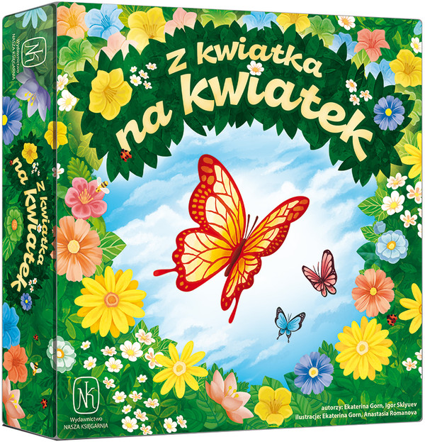 Z kwiatka na kwiatek / Igor Sklyuev, Ekaterina Gorn ; ilustracje Ekaterina Gorn, Anastasia Romanova. - Warszawa : Nasza Księgarnia, 2020. - 1 pudełko (54 kafelki (40 kwiatów, 10 pęków kwiatów, 4 altany); 40 motyli (po 10 w 4 kolorach); 4 karty kapelusze (w 4 kolorach ze skrótem zasad na odwrocie); 21 kart; woreczek; instrukcja) ; 26x26 cm.