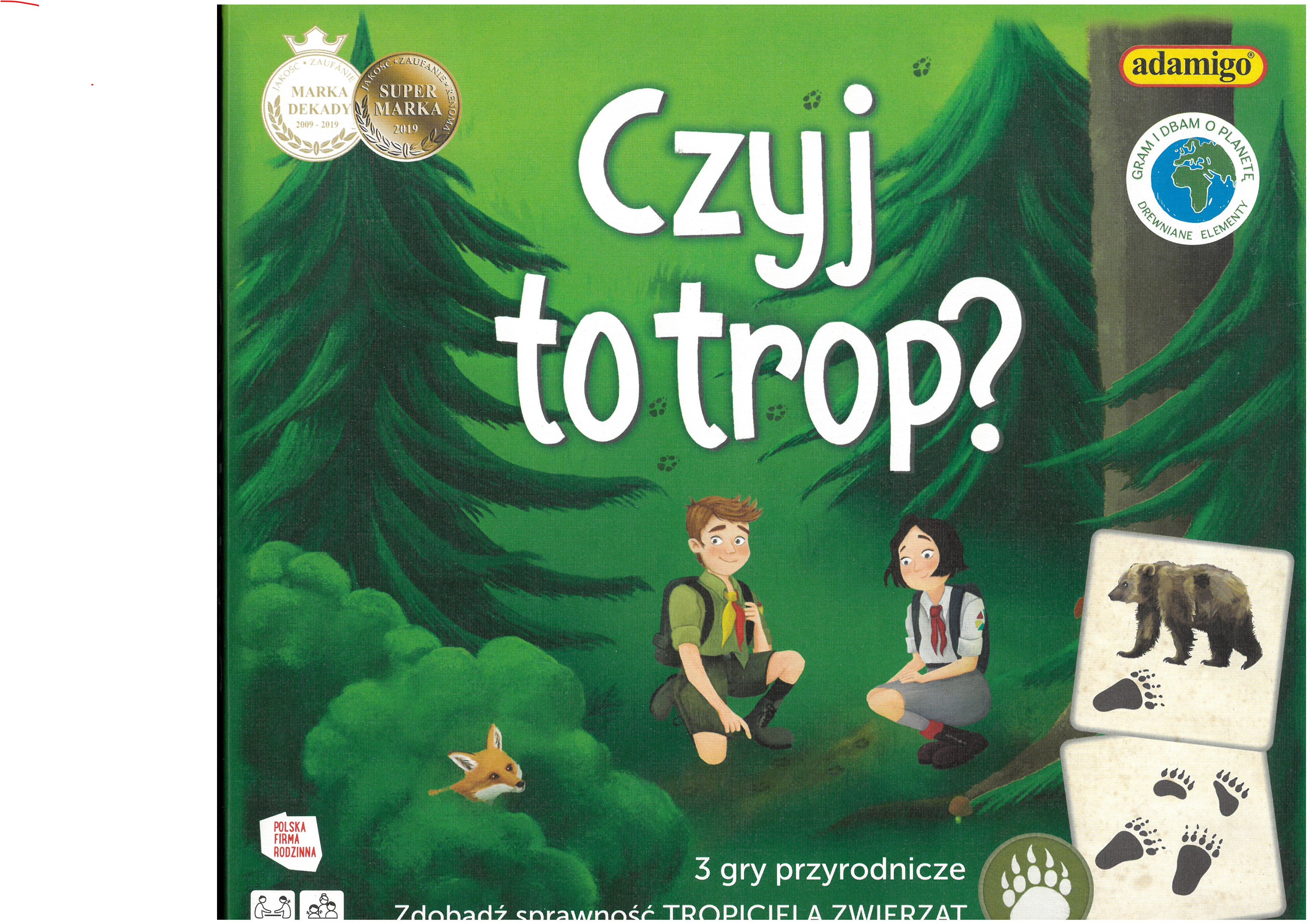 Czyj to trop? / ilustracje Anna Aldüz. - Częstochowa : Adamigo, 2021. - 1 pudełko (plansza lasu; karta ogniska; 20 tafelków; 35 żetonów; 2 pionki harcerzy i 2 stojaki; kostka do gry; instrukcja) ; 22x25 cm.