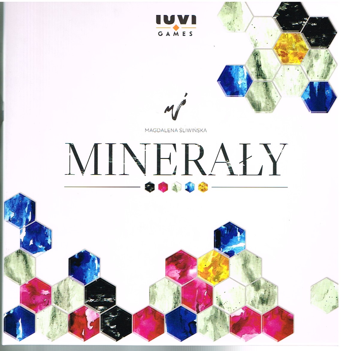 Minerały / Magdalena Śliwińska. - Kraków : IUVI, 2019. - 1 pudełko (118 kafli minerałów (53 białych, 30 niebieskich, 20 różowych, 10 czarnych, 5 złotych); 24 karty kolekcji; 5 silikonowych pionków w kolorach graczy; 5 planszetek graczy; 5 dwustronnych kafli narzędzi; 1 sakiewka; instrukcja) ; 29x29 cm.