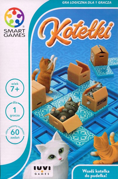 Kotełki / Raf Peeters. - Kraków : IUVI, 2022. - 1 pudełko (plastikowe zamykane pudełko-plansza; 5 figurek kotów; 4 płytki z pudełkami; instrukcja i książeczka z wzorami) ; 24x16 cm.